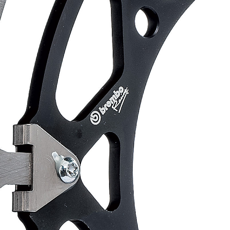 The connection between housing and rotor is ensured by a special guillotine hooking system (patent pending) which allows both radial and axial floating and reduces the overall weight of the disc, resulting in a significant advantage in terms of rideability compared to the traditional bushing system. Both performance consistency and the efficiency of disc and brake pads coupling during the running-in period have been significantly improved thanks to a rotor - in steel identical to that used for the discs in SBK and MotoGP - characterised by a new differentiated diameter hole pattern. The rotor height has also been optimised: maintaining a thickness of 5.5 mm, the height could be reduced to the advantage of containing weight and the moment of inertia with the consequential benefit of improved vehicle handling.